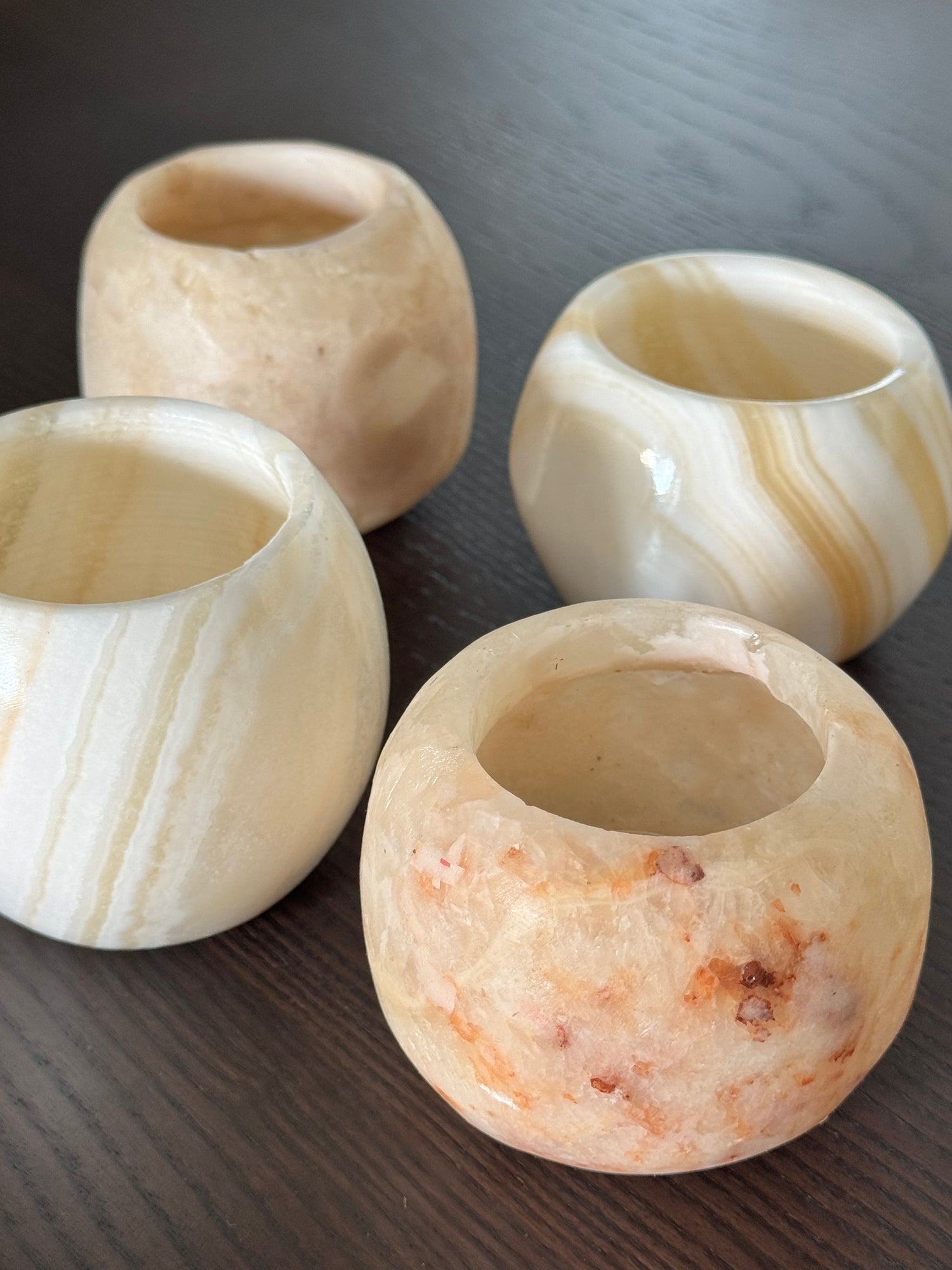L’albâtre gypseux, doux, lumineux et légèrement translucide, laisse passer la lumière avec poésie. Il est idéal pour des pièces comme les photophores, où chaque flamme devient un jeu d’ombres et de douceur.